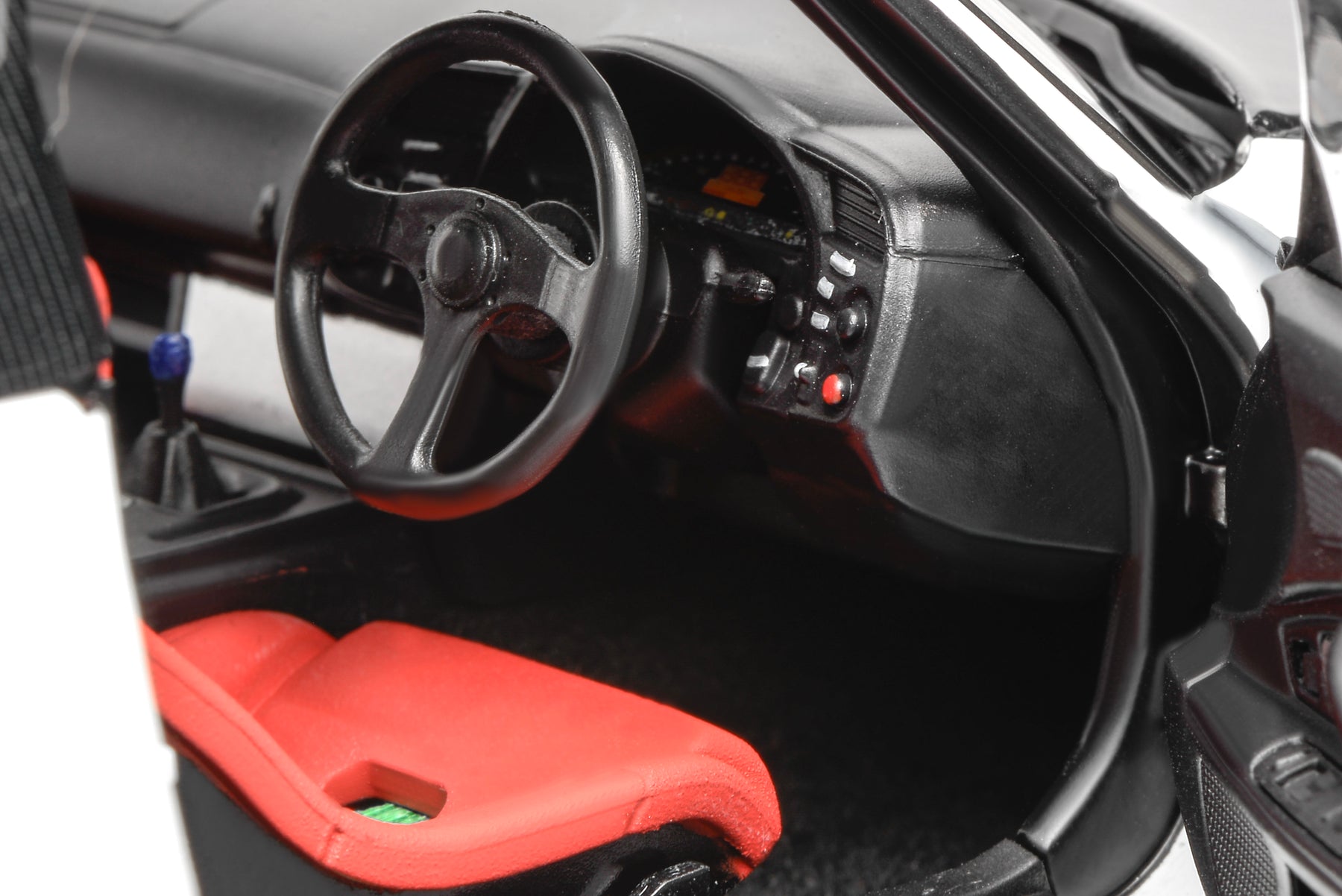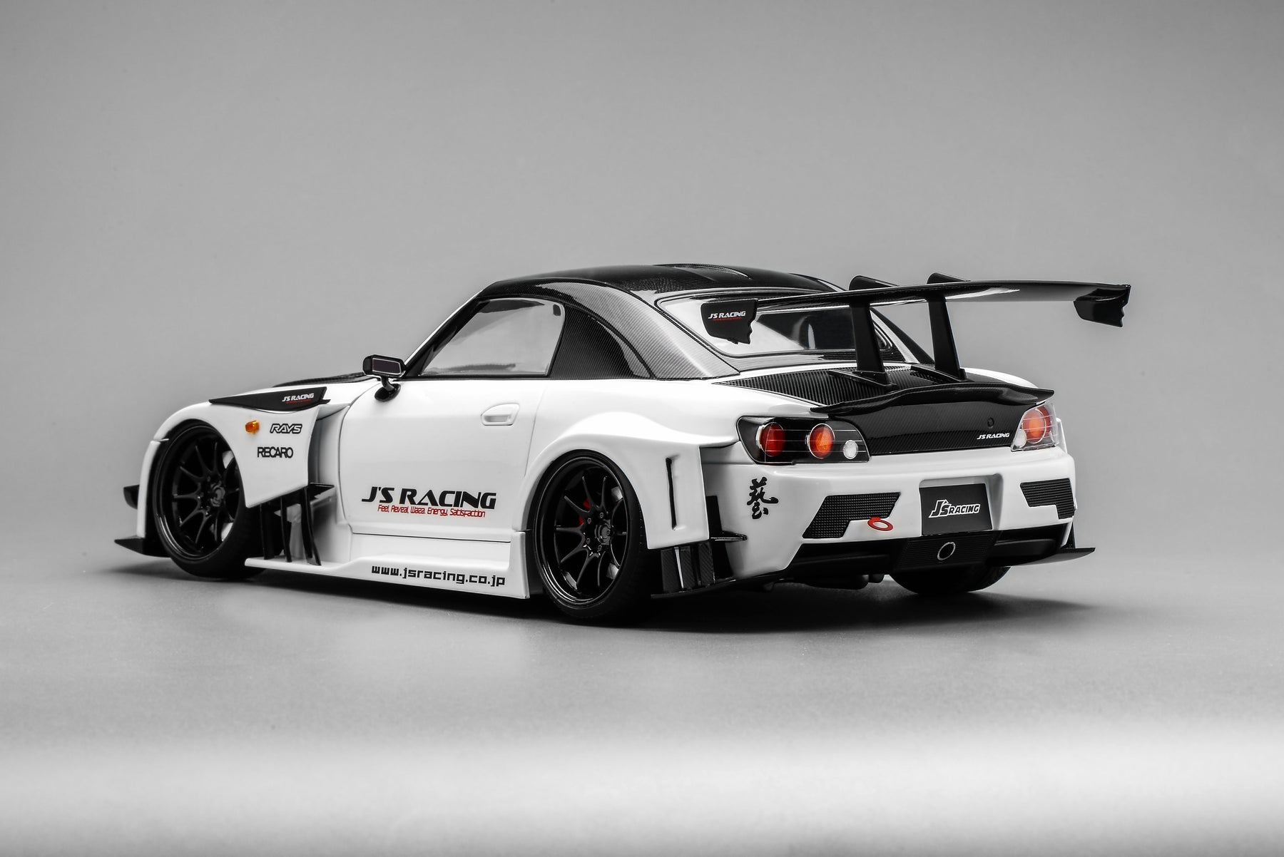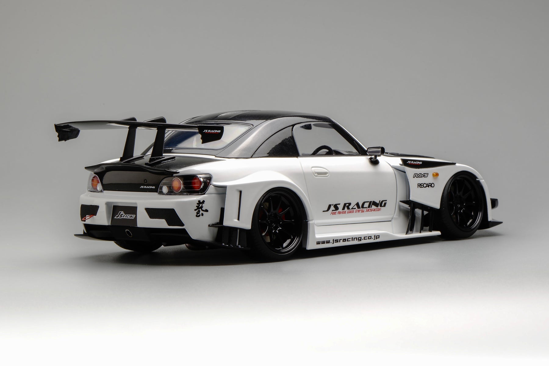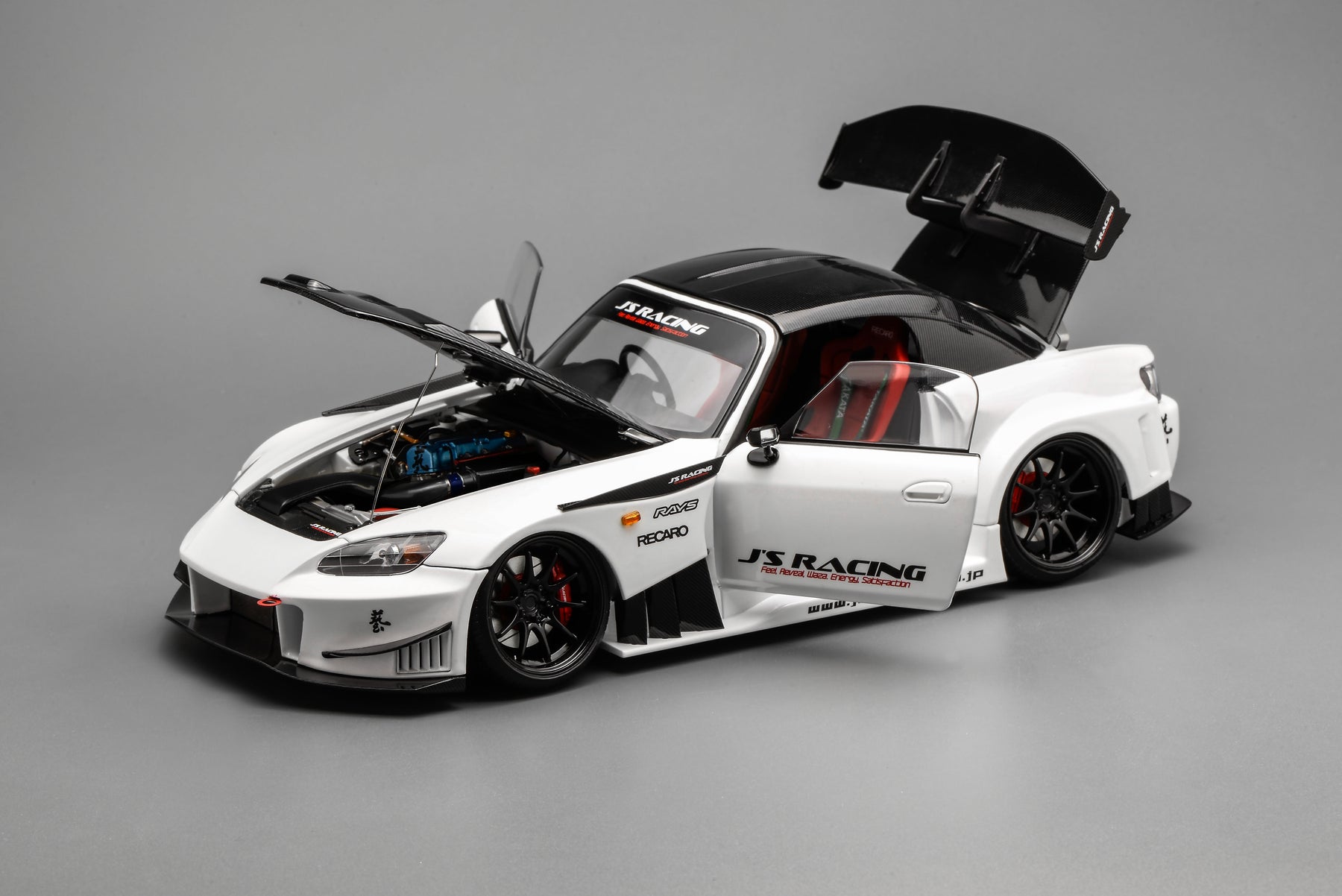 This scale model faithfully replicates the real J’s Racing vehicle, finished in metallic paint. Both doors and the front and rear hoods are fully operable, and the steering wheel is linked to the front wheels for synchronized steering. The model features an aggressive carbon-fiber widebody kit and track-focused interior details, giving the car a low, planted, and battle-ready stance with strong visual impact.