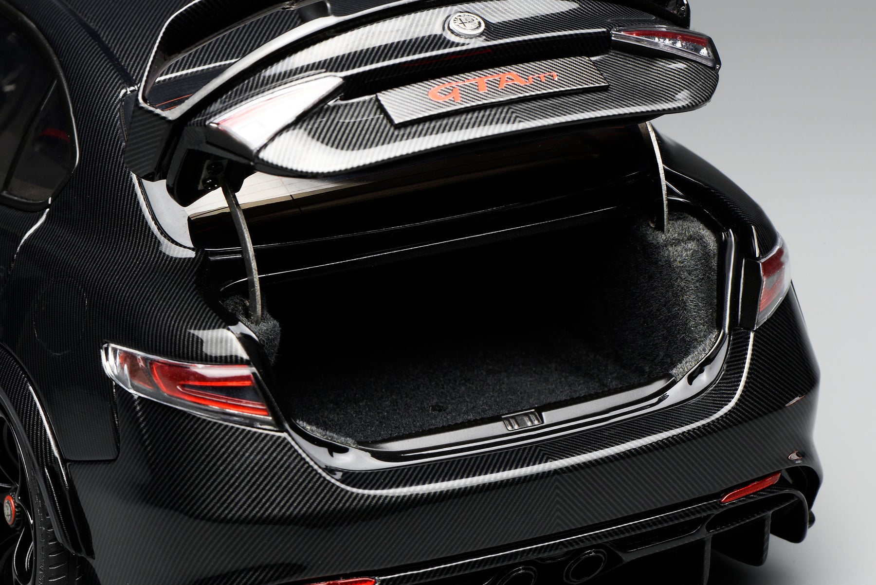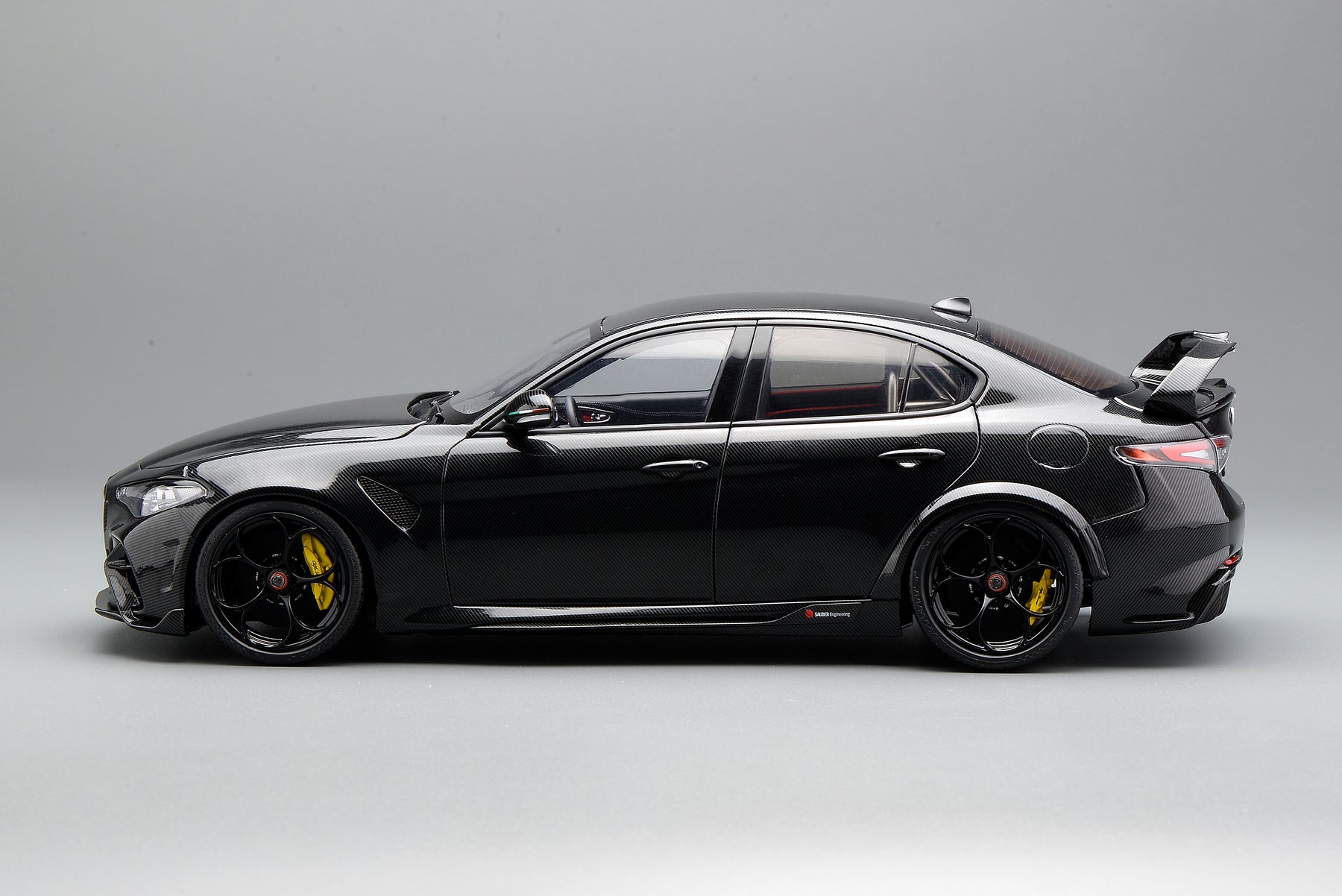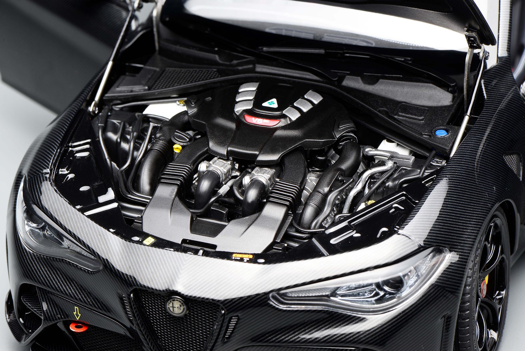 This scale model faithfully replicates the real vehicle, featuring full carbon-fiber water-transfer decals with a gloss clear coat finish. All four doors, as well as the front and rear hoods, are fully operable. The steering wheel is linked to the front wheels for synchronized steering, and the engine cover can be removed. The front undertray is designed as a magnetically mounted removable component, allowing clear visibility of the detailed engine internals once detached.